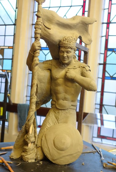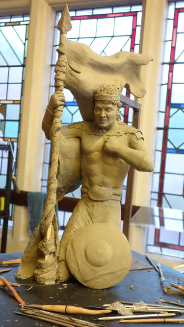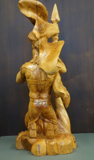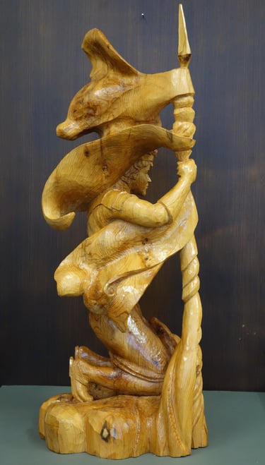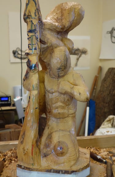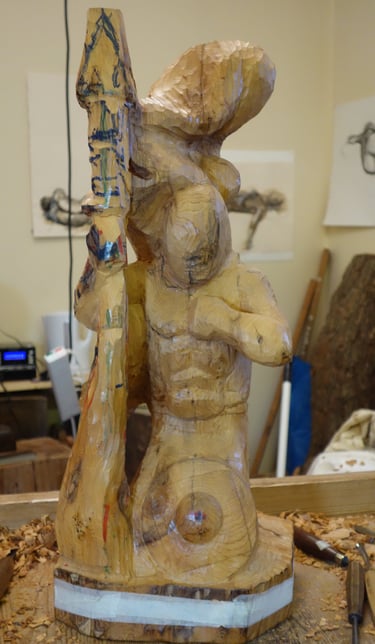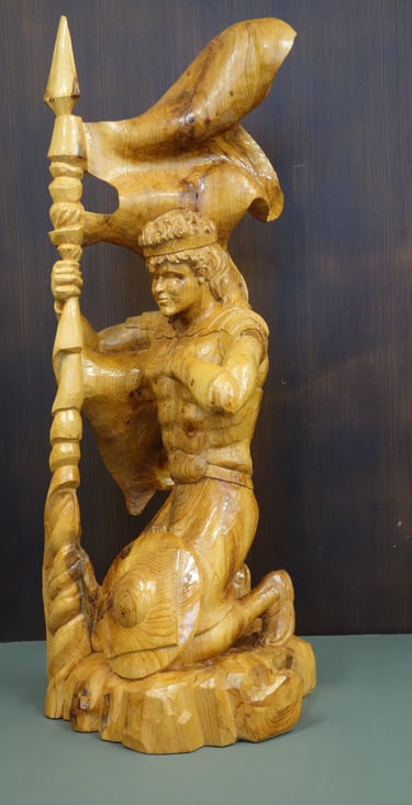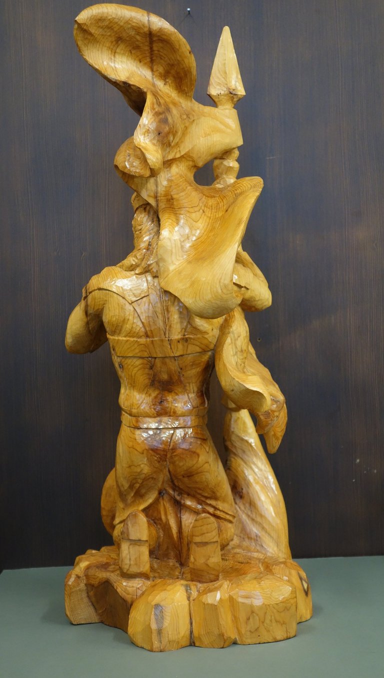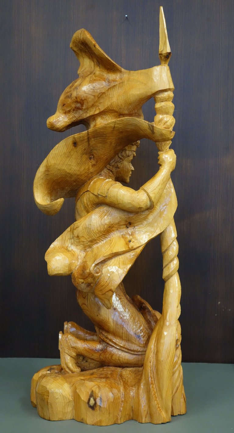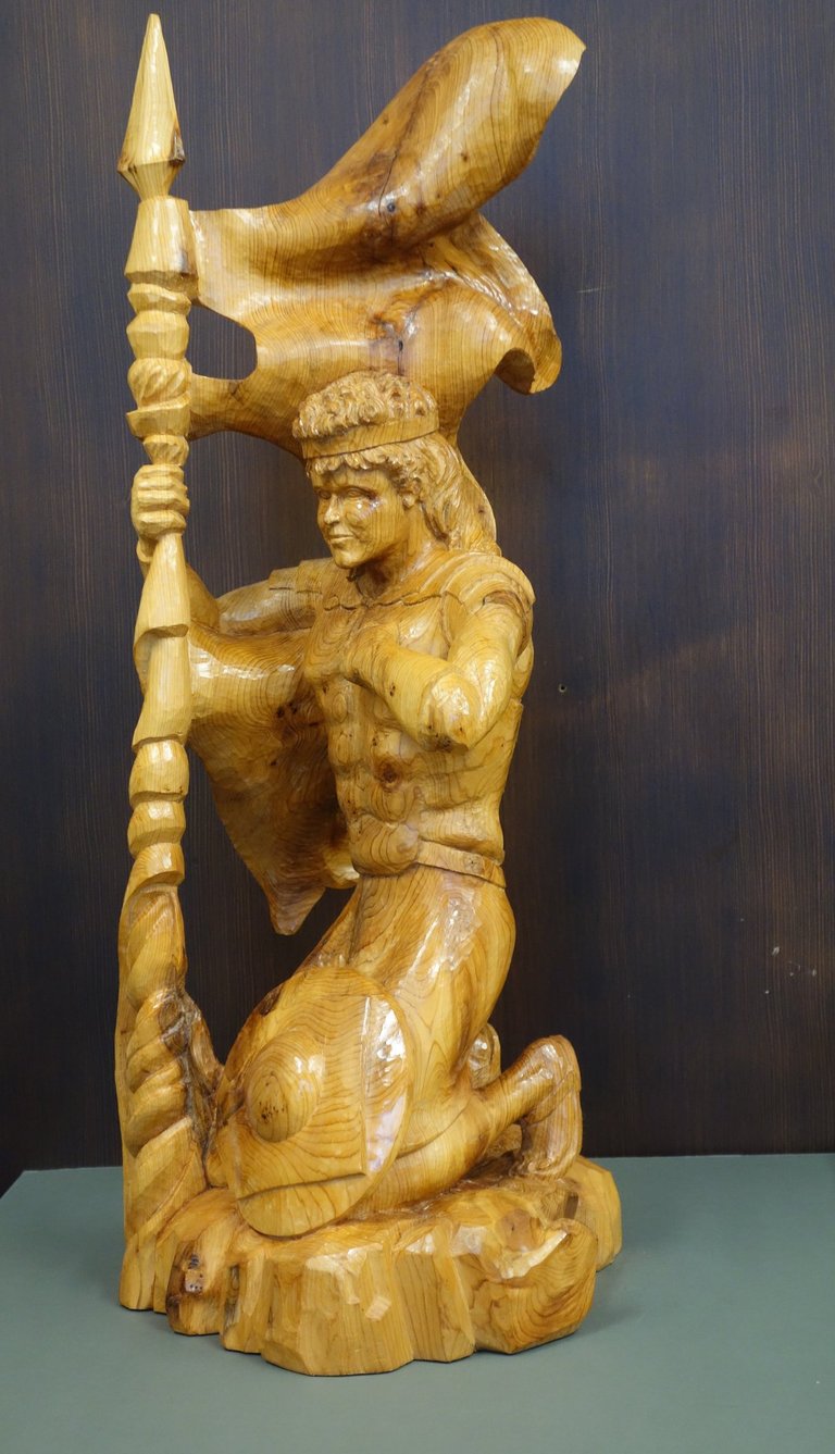 I was asked to create a sculpture depicting Captain Moroni - a Mormon saint. This required a great deal of research and discussion to get the depiction the client wanted. As the client wanted a wood with a visible grain and and it needed to be a stable hard wood to withstand the change of environment in California, I chose yew wood for the carving. It was carved from one log that had to be well-seasoned. Height is approximately 25cm
